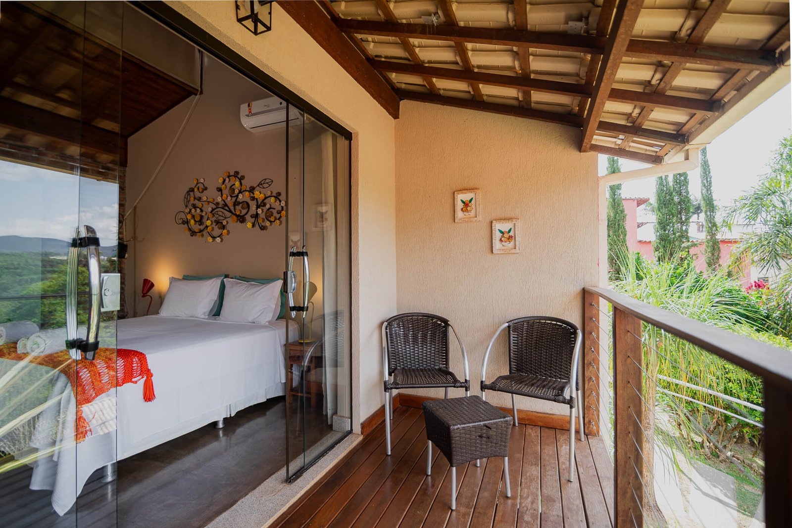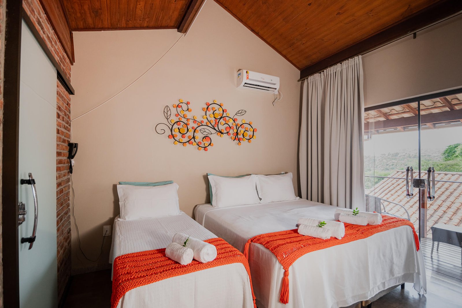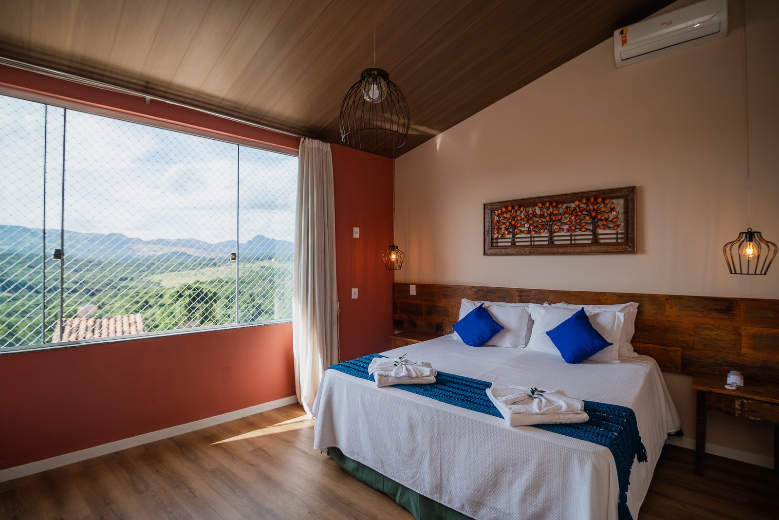 Nossas suítes foram projetadas com um estilo contemporâneo, criando um ambiente acolhedor através da harmonia entre modernidade e conforto. A combinação de elementos sofisticados e detalhes cuidadosamente planejados, aliada à vista panorâmica das montanhas e da natureza ao redor, confere charme e personalidade a cada espaço.
